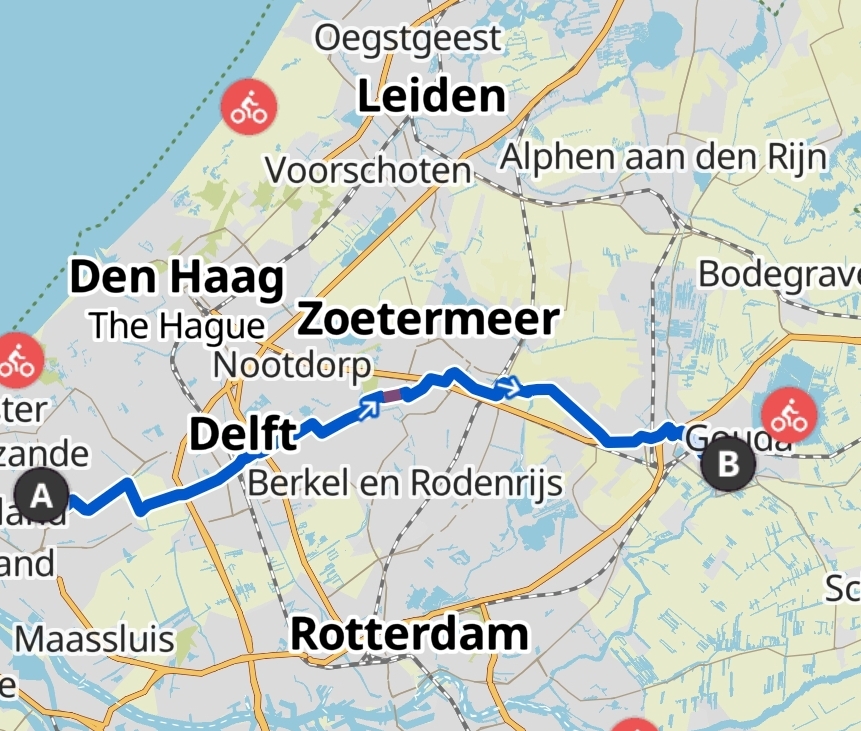Wind in de rug en veel fietssnelwegen dus trap de kilometers makkelijk weg. In een vloek en een zucht in Delft: